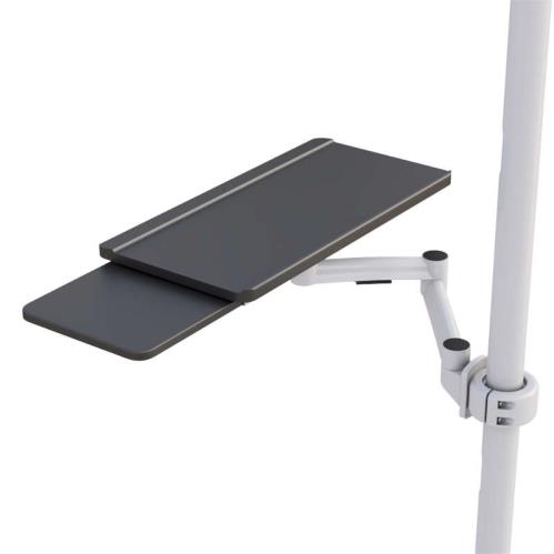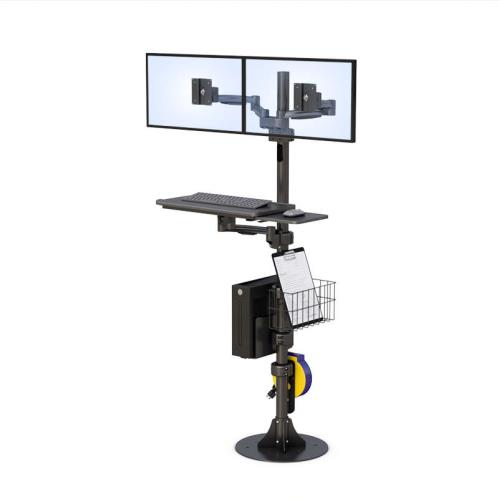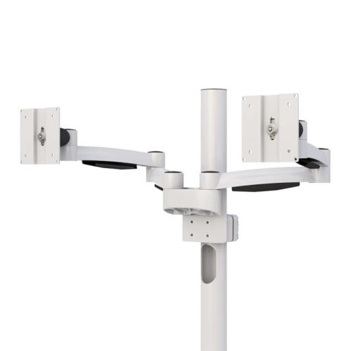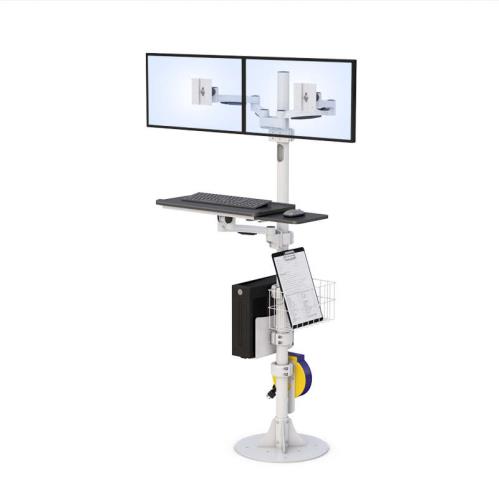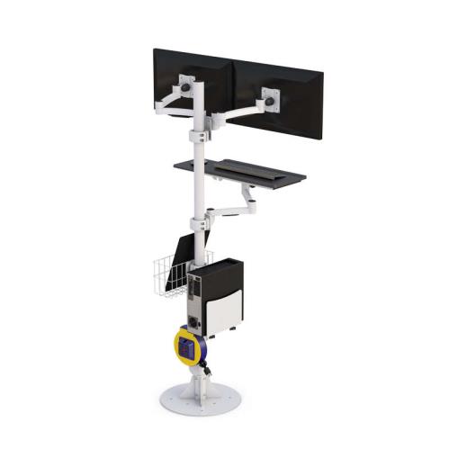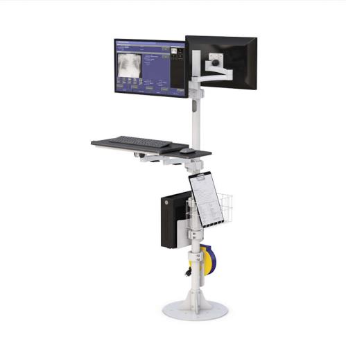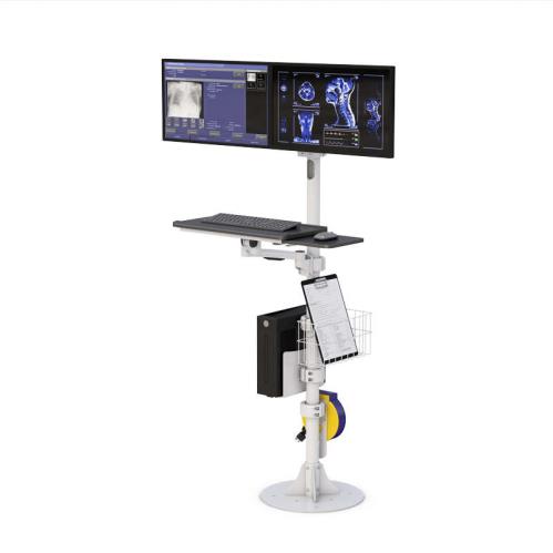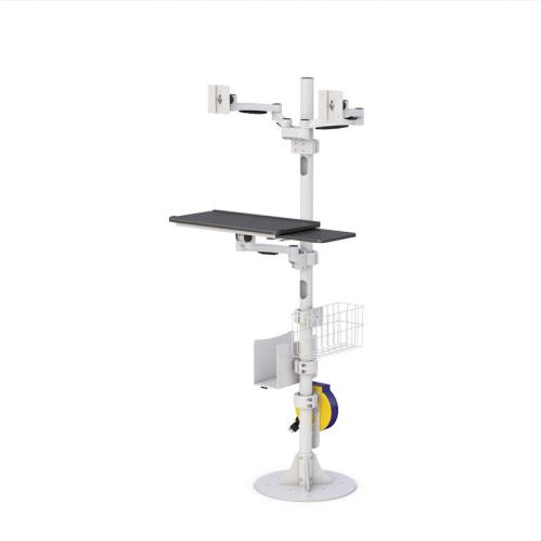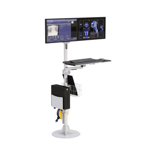 This Floor Mounted Medical Dual Monitor Stand offers convenience to the users with its useful built-in features. It also helps the users to become more efficient because this pole has adjustable features such as the articulating keyboard tray with sliding mouse tray that the user can position to it’s his desired position, and it gives the users access to all the computer peripherals.