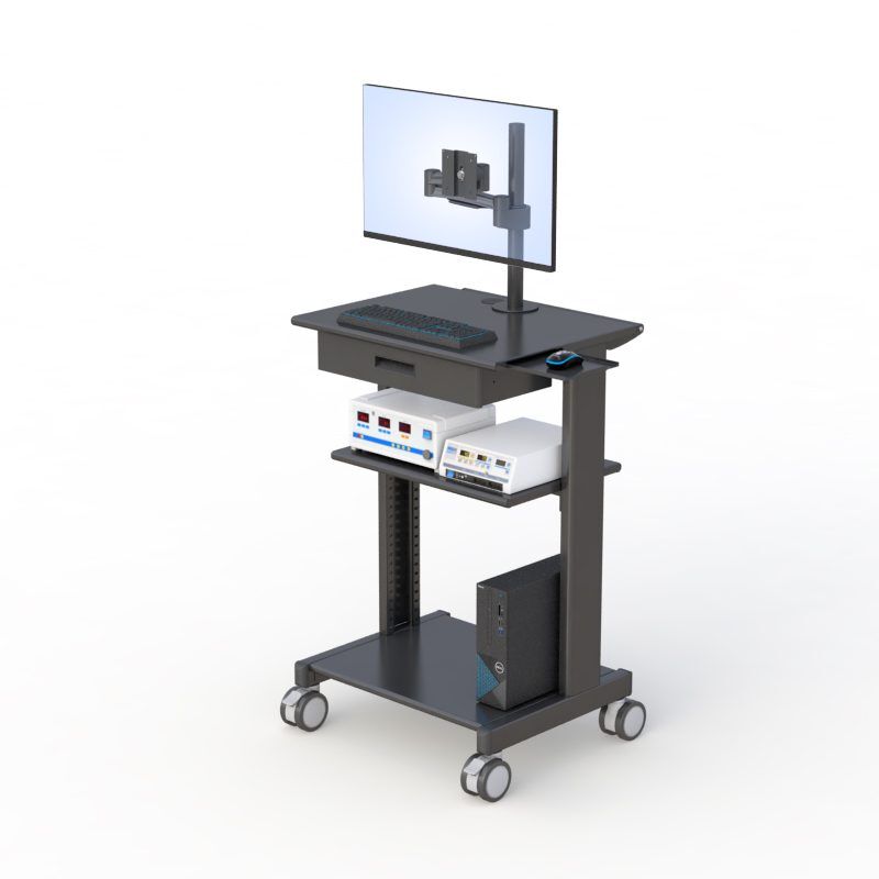 This mobile cart includes a pole-mounted monitor arm, retractable mouse tray, metal drawer, adjustable middle shelf, bottom shelf for equipment, and smooth-rolling casters for mobility. Its compact yet robust design makes it a practical solution for laboratories, patient rooms, and other clinical settings.